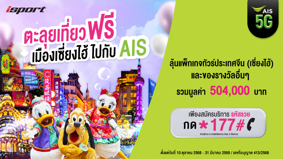 3. ระยะเวลาร่วมลุ้นรางวัลตั้งแต่วันที่ 10 ตุลาคม 2568 ถึง 31 มีนาคม 2569 จับรางวัล วันที่ 7 เมษายน 2569 เวลา 14.00 น. ณ บริษัท ไอ-สปอร์ต จำกัด และประกาศผู้โชคดี วันที่ 22 เมษายน 2569 ผ่านช่องทาง www.facebook.com/isportclub ผู้โชคดีต้องยืนยันสิทธิ์ในการรับรางวัลภายในระยะเวลาที่บริษัทกำหนดเท่านั้น โดยผู้โชคดีสามารถติดต่อรับของรางวัลผ่านช่องทาง Message Inbox ที่ Facebook Page: Isportclub หรือ ID Line: ISP.01 หรือโทร 0-2502-6767 (ในวันทำการวันจันทร์ – ศุกร์ เวลา 9.00น.- 16.00น.)